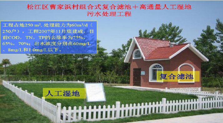 占地小:60m3/d处理量,设备占地面积约28m2,加人工湿地占地面积约250m2,为传统人工湿地技术的1/3;