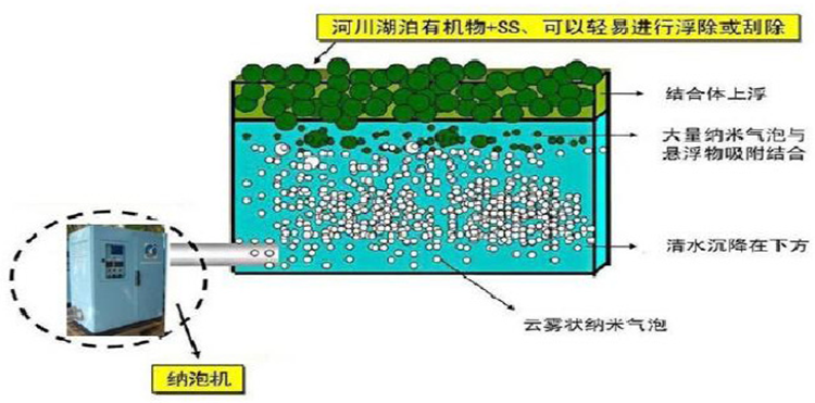 纳米气泡表面带有负电荷,所以气泡间难合为一体,在水体中能产生浓密而细腻的气泡,不会像常规气泡一样会融合增大而破裂。而且可以吸附水体中带正电的物质。利用表面电荷对水体微粒的吸附性,可以把水体中的有机悬浮物固定而分离,产生絮凝的效果,这特性是它得以在水处理中发挥出超常分离效应的关键所在。
